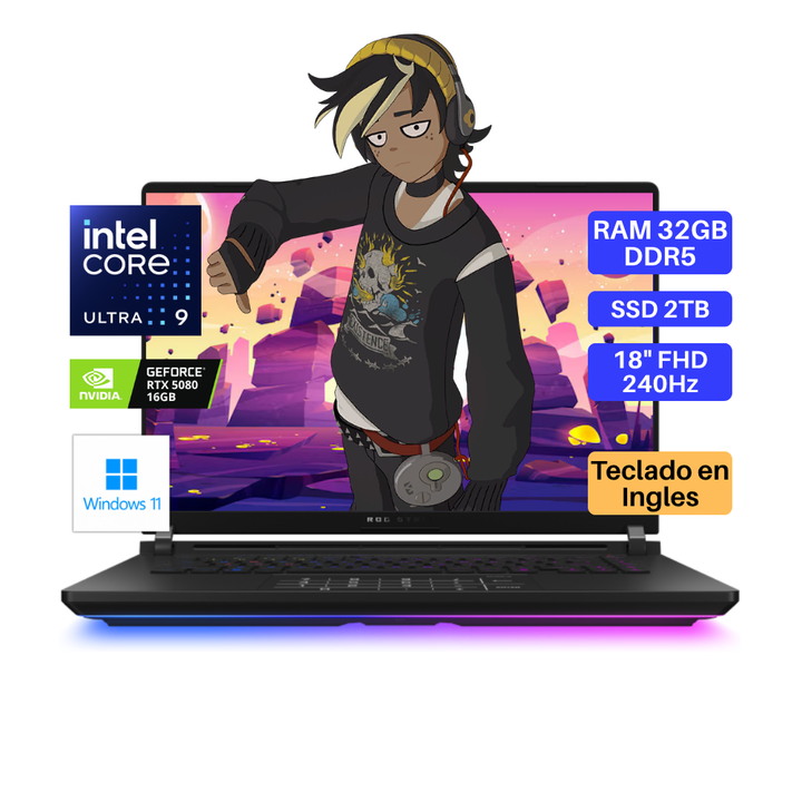 Laptop ASUS Rog Strix G18, Core Ultra 9-275HX, RAM 32GB DDR5, SSD 2TB, Video RTX5080 16GB, 18" FHD 240Hz, Teclado en Inglés, Windows 11.